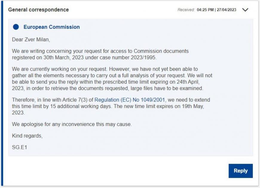 Ker njena dejanja izražajo močan dvom v nepristranskost in sum vplivanja na proces odločanja v dani zadevi, je evropski poslanec Evropsko komisijo, sklicujoč se na Uredbo št. 1049/2001 o dostopu javnosti do dokumentov Evropskega parlamenta, Sveta in Komisije, zaprosil za posredovanje: