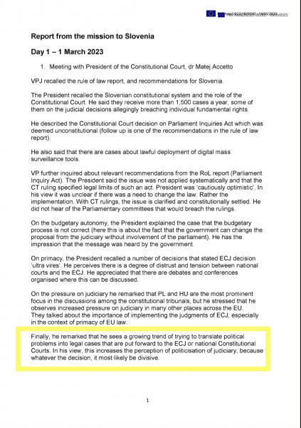 Kot je opozoril evropski poslanec se je podpredsednica Evropske komisije Vera Jourova med obiskom v Sloveniji, ki ga je opravila 1.3.2023, srečala tudi s predsednikom Ustavnega sodišča Republike Slovenije. Ker se je obisk zgodil le 10 dni po odločitvi Ustavnega sodišča, da zadrži izvajanje novele zakona o Radioteleviziji Slovenija (RTV), torej novele, ki jo je pred časom sama javno tudi podprla, si je marsikateri slovenski državljan in javnost ta obisk razlagala kot nedopusten politični pritisk na neodvisnost delovanja Ustavnega sodišča.