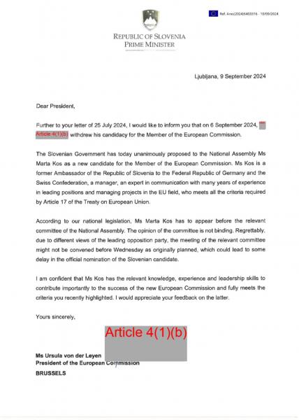 Evropski poslanec Milan Zver je nato podal zahtevo za razkritje dokumentacije Evropske komisije, povezane s postopkom imenovanja slovenskega komisarja. Še posebej je zahteval objavo pisma, ki ga je predsednica Evropske komisije poslala premierju Golobu, in sicer skladno z Uredbo (ES) št. 1049/2001, ki javnosti zagotavlja pravico do vpogleda v interne dokumente javnega značaja